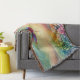 A quality printed throw has its advantages. This is a much finer weave throw than its loopier cousins, and though lighter, it is worth the investment for custom room accessorizing. The back is much prettier than the typical brown, and the fringe on the long sides very vivid, the selvage nicely done. Before photographing, I washed the throw in cold water, delicate, with a thicker woven throw the same size. On tumble dry low, this throw was dry in half the time as the other. This is a very practical quality if you use throws for furniture covers or to wrap up in frequently. The sleekness of the fabric makes it a great layer for accenting or protecting without the feeling of sitting on too much stuff. Perfect for napping or when you feel a light chill coming on. The color printing is beautiful and on this fabric, matched the design and color of my Photoshop image. This is an advantage for blending room fabrics and colors. The fringe on the short sides prints the colors from the design image and therefore varies from the side fringe. I streaked a white fractal line through the plaid pattern to give the illusion of weaving. This printed as crisp as an illusory thread, and put some white in the short side fringe, showing another advantage of print vs loomed- for artistic purposes, line lines, detail, and color integrity can be planned and preserved. My loomed throws have color limitations and more of a needlepoint texture. Print throws reproduce an exact image. The throw felt a little stiff straight out of the package, but this went away in the first delicate wash. Of course I searched the wash water for ink or bleeding and there was none.