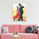 The painting depicts two dancers, frozen in a moment of graceful motion. The figures are dressed in vibrant costumes that suggest movement even while standing still. One dancer is a tall, slender woman with long hair that cascades down her back, while the other is a man with a hat and defined features.