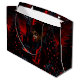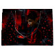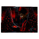 The dark christmas time. Christmas elf in the shadow of the gothic christmas night whose pointed ears protrude from his shimmering mane like the delicate leaves of an old tree stands in the dim twilight of a gothic cathedral, where shadow and light are interwoven in an eternal dance. A Christmas tree, decorated with red ornaments, rises majestically in the background