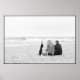 The photography shows man and woman sitting on the beach ant looking at the sea