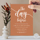 Announce your happily ever after in style with our modern brown copper theme design (The day Before) wedding rehearsal brunch or lunch celebration invitation card. It is ideal for couples who have decided to celebrate the day before their big day. With its sophisticated yet playful design, this invitation is sure to set the tone for an unforgettable event. The invitation card features modern romantic script design, adding a touch of timeless elegance to your celebration. Designed by TeeshaDerrick