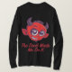 Vector cartoon illustration of a devilishly cute little devil with big eyes with The Devil Made Me Do It text. Keywords: devil, hell, cute, demon, evil, satan, halloween, monster, horns, horror, adorable, sweet, devilishly, devilish, precious, endearing, loveable, lovely, appealing, engaging, delightful, dear, darling, winning, winsome, charming, enchanting, attractive, pretty, adorbs