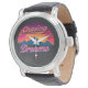 This design captures a vibrant, retro-inspired sunset scene. A stylised sun, with a striking gradient from deep purple to fiery orange, sets behind a detailed mountain range. The mountains are rendered in deep blues and blacks, with a line of dark pine trees at their base. The text "Chasing" and "Dreams" frames the image in a bold, retro font with a bright pink and blue colour scheme, evoking a sense of adventure and optimism. It's a perfect blend of natural beauty and a retro aesthetic, ideal for those who love travel, nature, and vintage art styles.