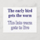 Humourous saying about the benefits of being lazy and sleeping in! Reads "The early bird gets the worm. The late worm gets to live."