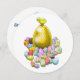The Easter chick stands on top of the large golden Easter egg, which stands among all the small colourful Easter eggs ready for this year's Easter.
