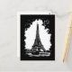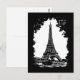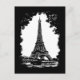 Black and white art travel postcard featuring a grunge vintage style illustration of the Eiffel Tower in Paris, France.