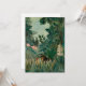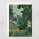 The Equatorial Jungle (1909) by French post-impressionist artist Henri Rousseau. Rousseau derived his many jungle scenes from reading travel books and visiting the Paris botanical garden. He was a self-taught artist and is considered to be a naïve or primitive painter. His work had an extensive influence on several generations of avant-garde artists.