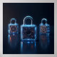A futuristic collection of digital locks and padlocks featuring glowing circuit patterns against a dark gradient background. Metallic and glass accents, pulsing lights, and intricate designs blend organic and synthetic elements, evoking advanced security and high-tech sophistication.