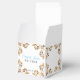 An images of fancy Golden leaf borders encompass all sides of this White fold top square box-shaped favour box. Has the newlyweds personalised names on the front in Sky-Turquoise Blue and last name highlighted in Black. Top has phrase of "Time & Eternity" inside the borders. Personalised wedding date at bottom. Sample names and date shown. Customise this item if desired.