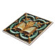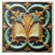 A ceramic tile featuring an open book codex at the centre, surrounded by ornate, symmetrical vines in a palette of gold, turquoise, and dark green. The book is depicted with a raised, three-dimensional effect, its pages slightly yellowed, suggesting age or a vintage aesthetic. Flanking the book are stylised floral or foliate elements in gold and turquoise, adding to the symmetrical composition.