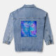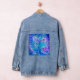 This denim jacket boasts an abstract floral design in shades of blue, lavender and purple.