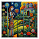 A.I. created print of a young lady stands in a field of tall, colorful flowers with a unique built house in the background under a night sky above is filled with swirling, luminescent patterns.
