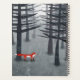A lone wild red fox stands beneath the pine trees in a dark forest. For nature, wildlife and animal lovers.