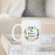 Inspiring mug design for women who change the world features the quote "the future is female" in brush script lettering, inscribed inside a watercolor floral wreath in blue, ivory and green.