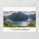 Postcard with the whole Geirangerfjord, a famous fjord in Norway, ending at the small village of Geiranger, seen from Eagle's Bend. A fjord is a water inlet between the mountains. It has a white border and the text: 'Norway'.