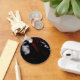 A masked skull worn with a black hooded cape and a black gloved hand inviting you to come. A maroon curtain is used as a backdrop in this photo. This is available on assorted styles and sizes of keychains.