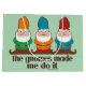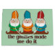 The Gnomes made me do it. 3 different coloured gnomes hanging out. Parody / spoof of The devil made me do it. 3 gnome images. Green / Turquoise background. Fully customisable.