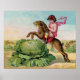 Herds of 'hoppers' are bounding through the vegetable patch. A miniature jockey urges his bunny along as it bounces over cabbage obstacles. The colorful humorous image is perfect for decor, accessories and correspondence.