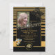 A luxurious shimmering gold silk texture draped through two wedding rings on a dramatic black background with a Deco style stripe to give the design a chic and glamourous look to personalise with a photo of the bride