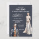 An ornate faux silver art deco style frame acts as a divider between white customisable templates on a dark blue grey background that frame a beautiful bride and groom dressed in 1920's attire. She is wearing a sleeveless lot cut elegant off white bridal dress and he is donned in a double breasted brown and grey suit with a stylish hat that has a black band around its base. A small posy of roses clutched by the bride is the ideal bouquet to complete this vintage look. The design is suited to a roaring twenties; 1920's; great gatsby; vintage art deco themed event or celebration. They are perfect for both business and personal use. The back is the same ivory white colour as the front.