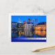 Postcard of the skyline of the Hague city, the government centre of the Netherlands, at the beginning of the evening at Blue Hour with the modern architecture skyscrapers behind historic Mauritshuis museum, Binnenhof parliament building and Hofvijver lake with a white fading bar and the text: 'The Hague'.