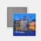 Souvenir photo magnet of the skyline of the Hague city, the government centre of the Netherlands, at the beginning of the evening at Blue Hour with the modern architecture skyscrapers behind historic Mauritshuis museum, Binnenhof parliament building and Hofvijver lake with the text: 'The Hague, The Netherlands'.