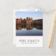 Photo postcard of the modern skyline of the city centre of The Hague together with historic Mauritshuis museum and the seat of government Parliament building with reflection in the still water of Hofvijver lake at dusk in The Netherlands with a white box with the text 'The Hague, The Netherlands' and lines in red, white and blue, the colours of the dutch flag.