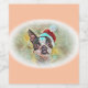 The head of a Boston Terrier dog looks through a hole in a yellow paper Santa hat.Creative. Minimalism. New year concept.