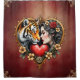 The heart of the hidden wilderness, a majestic tiger, and the profile of a woman are artfully blended. Both motifs are embedded in an elegant, heart-shaped frame, underscoring the romantic mood. The frame is richly decorated with delicate floral patterns that harmoniously wind around it, lending it a playful, imaginative touch. Amidst the flowers is a bright red heart, symbolising love and passion.