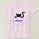 A simple yet distinctive artwork design of a hidden cat's face, its glowing purple eyes appearing in the dark, with a speech bubble containing the word "Meow!" in the same colour, adding a mysterious a