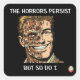 The image features a vintage-style cartoon man with slicked-back hair and a wide, unsettling grin. However, one side of his face is horrifically disfigured, appearing as if it has been burned or melted away, revealing raw, grotesque flesh beneath. Above and below the image, bold white text reads: "THE HORRORS PERSIST, BUT SO DO I." The black background makes the stark contrast of the text and the eerie, macabre nature of the illustration stand out even more. In the bottom right corner, a small emblem adds an official or propaganda-like touch to the design. The overall tone is darkly inspirational, suggesting resilience in the face of horror or suffering.