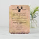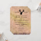 Elegant and Rustic, "The Hunt is Over" Wedding invitation. Deer trophy head silhouette at the top with words "The Hunt Is Over" surrounding him. Background is a sky gradient of pinks and light brown cream with a gradient pink to black field of grass. Buck hand drawn by ©Tina Hesskew of Fishing Hunting Life.