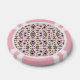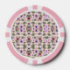 The image shows poker chips with a floral pattern. The front and back feature pink edges and colorful flowers against a light background, creating a playful vibe.