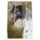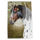 Original digital artwork by Jayne Wilson features a head portrait of an Appaloosa Indian Pony in a red headstall, with golden accents and feathers.