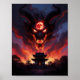 A temple stands in solemn silence, its gates glowing with an ominous red light, while above it looms a colossal demonic visage forged of smoke and flame. From its forehead burns a blood-red eclipse, casting the sky in fire and shadow. The horned beast’s fiery eyes and jagged fangs dominate the heavens, as if the very air is consumed by its wrath. The contrast of the tranquil, ancient architecture beneath the raging inferno paints a scene of cosmic dread—an omen of a world on the brink of being devoured by darkness.