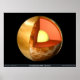 This picture shows a cutaway view of the possible internal structure of Venus. The image was created from Mariner 10 images used for the outer atmospheric layer. The surface was taken from Magellan radar images. The interior characteristics of Venus are inferred from gravity field and magnetic field measurements by Magellan and prior spacecraft. The crust is shown as adark red, the mantle as a lighter orange-red, and the core yellow.