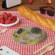 the man and woman are decorated with a geometric pattern of yellow black and white rectangles and psychedelic trippy swirls, and colorful polka dots respectively.