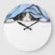 Original fine art design of a young tuxedo kitten stalking a bug by artist Carolyn McFann of Two Purring Cats Studio printed on a quality and customisable wall clock for cat lovers.