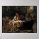 In a world woven with secrets and curses, lived a young woman known only as the Lady of Shalott. Confined to a lonely tower on an island, she was bound by a mysterious decree. The world outside, a tapestry of vibrant life flowing towards the grand Camelot, remained a forbidden sight. She could only glimpse it through a magical mirror, its reflections painting fleeting images on her loom. --- The Lady's days were filled with the rhythmic click-clack of her loom, weaving tales of a world she couldn't touch. The whispers of wind rustling through the willows and the distant chatter of reapers were her only companions. Yet, a yearning bloomed within her, fuelled by the whispers of a curse; a curse that threatened her very existence if she dared to look directly upon the world. --- One fateful day, the mirror betrayed its usual mundane reflections. It shimmered, revealing a knight of unparalleled grace, his white steed a stark contrast against the verdant landscape. Sir Lancelot, his name echoed in a forgotten song, stole the Lady's breath. Unable to resist the pull of his image, she defied the curse, turning her gaze to the forbidden window. --- The world flooded her senses, a symphony of colour and sound. But with this stolen glimpse came the chilling confirmation of the curse. As she uttered a choked cry, her world dissolved into chaos. The loom, her life's companion, lay abandoned, its threads mirroring the unraveling of her fate. --- This story, though born from the verses of Alfred Lord Tennyson's haunting poem "The Lady of Shalott," transcends the page. It is a visual masterpiece brought to life by the brushstrokes of John William Waterhouse. --- John William Waterhouse (1849-1917), a renowned Pre-Raphaelite painter, captured the essence of the poem in his iconic 1888 artwork. The Lady, draped in crimson, sits poised for a journey down the river. Her pale beauty reflects both defiance and despair. The abandoned loom, the overturned candles, and the overflowing boat all speak of a life cut short. The painting, like the poem, leaves us pondering the consequences of forbidden desires, the power of fate, and the beauty trapped within isolation. --- Alfred Tennyson (1809-1892), a pillar of Victorian poetry, penned "The Lady of Shalott" in 1832. The poem's rich symbolism and captivating narrative resonated with Waterhouse, inspiring him to translate the verses into a visual masterpiece. Together, the poem and the painting offer a timeless exploration of human emotions and the price of yearning for a life beyond reach.