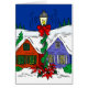 This card is featuring homes decorated for Christmas with the mountains and snow in the backround. The lamp post has a big red bow and garland wrapped around the post with pointsettas lining the bottom. The houses are all decorated for Christmas. The mountains are snow covered and lined with pine trees. Customise with your own words and name.