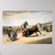 Vintage 1860s Lake Price illustration showing a matador, during a bullfight, leaping from the path of a charging bull as it dives into the cape.