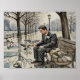 Great quality poster with a watercolor reproduction of park scene. The Long Await depicts a handsome man on a park bench awaiting the arrival of someone. He bides his time still hopeful while feeding pigeons in a dreary setting.