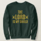 This sweatshirt features an antonio bold print font with golden coloured letters displaying the biblical phrase "The Lord Is My Shield" with a sword and shield icon on each side in this biblical saying theme. This sweatshirt is made from 100% cotton this shirt is both plush and durable which make a great combination has smaller matching image on the back.