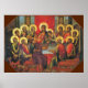 colourful painting in reds and golds of 'the last supper' by simon ushakov. jesus is at a long rectangular table with twelve apostles with golden halos. wine goblet and gold platter with bread at the table in an interior decorated with a beautiful red drape. bright bold colours and beautifully balanced painting with a lovely flow of golden halos creating a playful pattern. decorative, icon style, and painted in the seventeenth century a bright and boldly coloured iconographic style painting of the new testament story of the last supper.