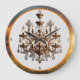 This striking image showcases an iconic chandelier, its intricate crystals and radiant lights meticulously detailed in fine lines. Bathed in golden hues, the chandelier embodies luxury and sophistication, creating a mesmerising interplay of light and shadow against a soft, light-coloured background.
