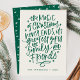 Send magical holiday greetings to friends and family with our festive non-photo holiday card. The phrase "The magic of Christmas never ends, its greatest gifts are family and friends" is displayed in a green hand-lettered script with a beige background. Personalise the front of the cute holiday card by adding your name and the year. The card reverses to feature your custom message in green text inside of a beige rectangle frame. The background features a pattern of beige stars and dots against a green background.