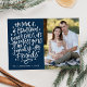 Send magical holiday greetings to friends and family with our festive photo holiday card. The phrase "The magic of Christmas never ends, its greatest gifts are family and friends" is displayed in a white hand-lettered script with a navy background. Personalise the front of the cute holiday card by adding your name, year, and photo. The card reverses to feature your custom message in white text inside of a navy rectangle frame. The background features a pattern of navy stars and dots.