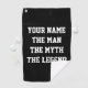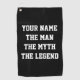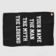 The man the myth the legend funny golf towel gift. Personalised presents for him or her. Monogrammed golfing gifts for men and women. Modern typography template for name or surname. Humourous Birthday gift ideas for legendary golfer, husband, dad, father, friend, co worker, boss, colleague, coach, instructor, trainer, teacher, grandpa, retired person, golf lover etc. Add your own surname or funny quote. Including hook to hang it up. Unique golf accessories for friends and family.
