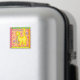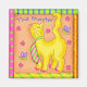 “The Master” cat is loaded with attitude and shows it by wearing a snazzy fuchsia and green striped tie. Tail and nose in the air, this cat is oblivious to the adorable bugs flying around him. Fuchsia paw prints and green dots are tossed randomly on an orange background with the text reading “The Master”. A whimsy multi-colour border surrounds the image. “The Master” yellow cat is one of 10 cats from Phyllis Dobb’s “Meow Meow” fabric collection.
