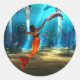 A colourful fantasy image featuring a beautiful mermaid playing with a dolphin amidst ancient Greek ruins at the bottom of the sea.